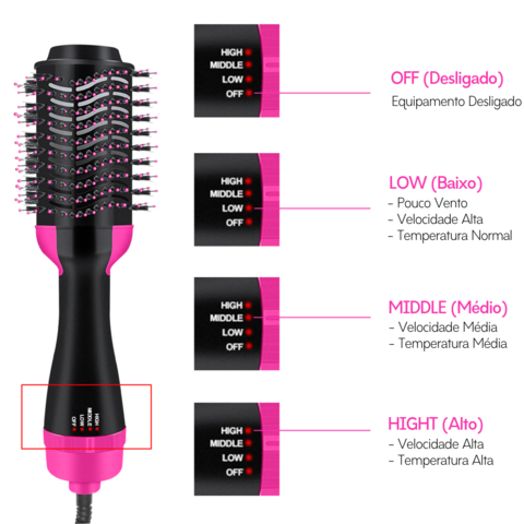 - Seletor de temperatura: 3 opções de ar quente