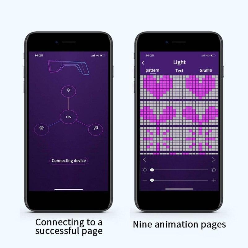 Através do APLICATIVO GRATUITO (GlowGlasses - verde) disponÃvel na Apple Store ou na Google Play, você pode escrever sua mensagem, desenhar sua figura e fazer animações! Além de poder sincronizar com a música que você está ouvindo e exibir no equalizador.